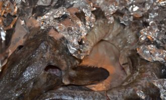 - Verwarm de oven voor op 200 graden. Spreid nu de folie uit op een bakplaat en leg de vis er voorzichtig op. We fixeren de folie erop zodat het sap er niet uitloopt en zetten het 25 minuten in de oven, openen dan de folie en laten de vis nog 30 minuten bakken.