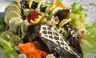 We zetten de vis op een serveerschaal, waarop we eerst een "kussen" van slabladeren leggen en decoreren met kwarteleitjes gesneden in de vorm van "kronen", dunne plakjes limoen en citroen, "rozen" gemaakt van gekookte wortelen . Je kunt een net van mayonaise op de kop van de vis trekken, versieren met granaatappelpitjes. Fantasie in decoratie kent geen grenzen.