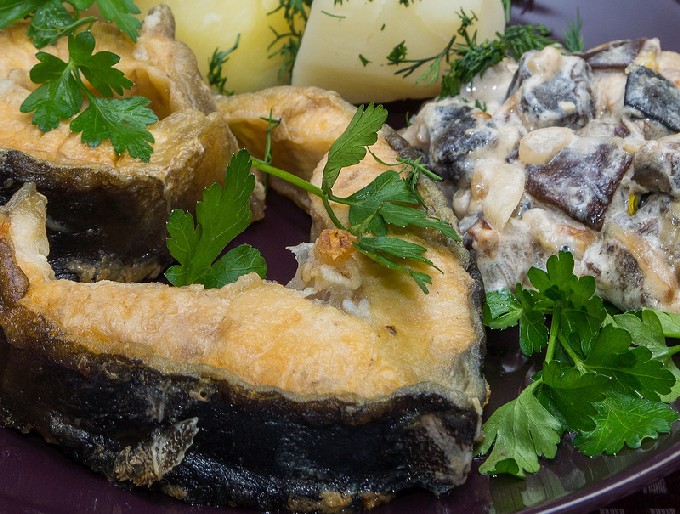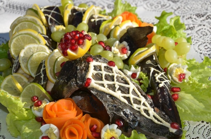 - We verspreiden de afgewerkte vis op een grote mooie schaal, om je heen kun je verse komkommers leggen, in blokjes gesneden, tomaten in de vorm van bloemknoppen met kruiden en citroen.