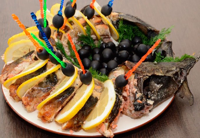 - Leg de afgewerkte vis op een schaal, verwijder de folie, versier de vis met slablaadjes, groenten of fruit, olijven, olijven, kappertjes of naar eigen smaak.