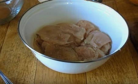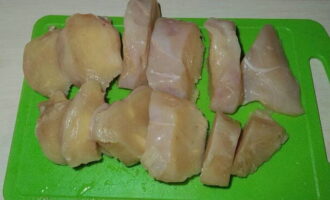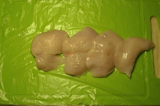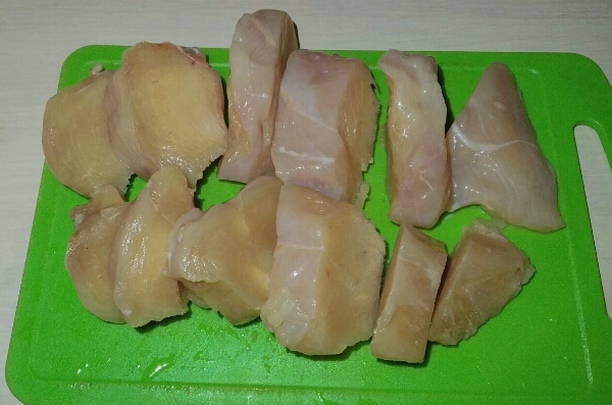 - Kippenvlees bereiden. We wassen het en drogen het met keukenpapier. Hiermee wordt overtollige vloeistof verwijderd. Daarna snijden we het in stukjes, waarvan de dikte niet meer dan 2 cm is. Kippenvlees moet, net als elk ander, over de vezels worden gesneden.