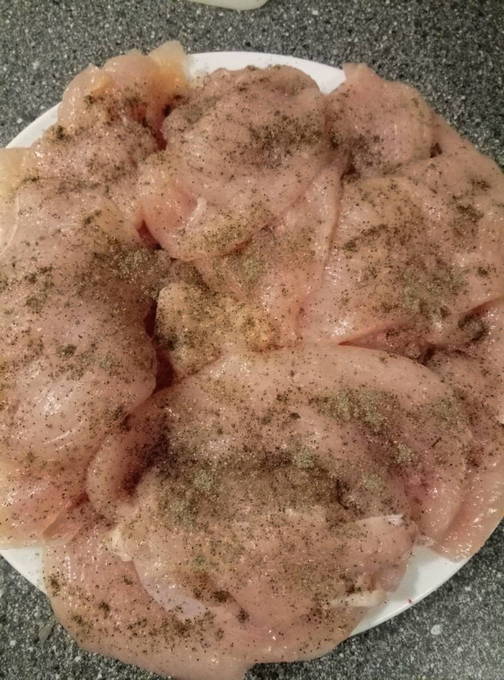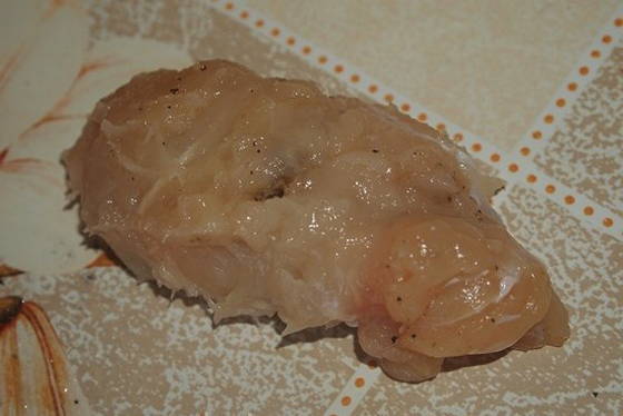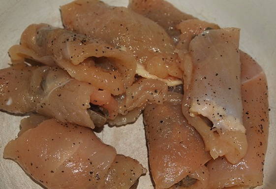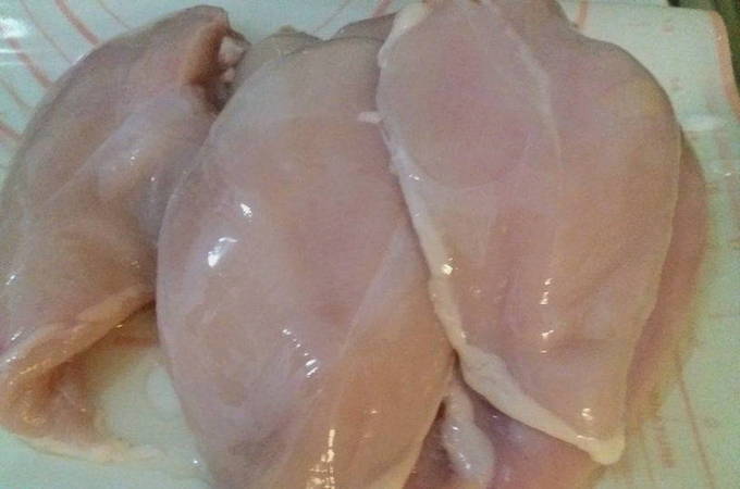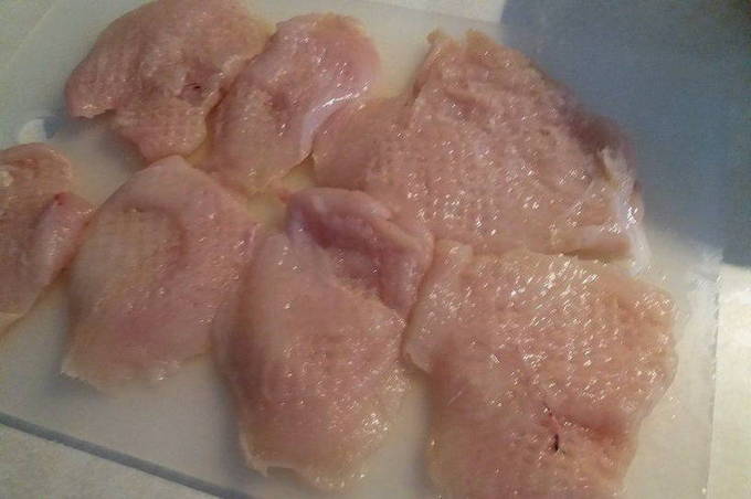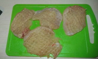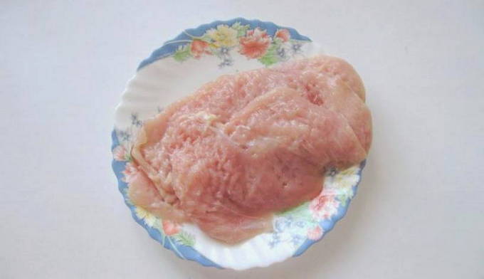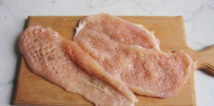 - Bereid de kipfilet voor. Spoel het eerst af in koud water en droog het af. Trek vervolgens de folie eraf en verwijder eventueel aanwezig vet.Snijd de filets in borden. Wikkel elk bord in huishoudfolie en sla af met een speciale hamer. Kruid de karbonades vervolgens met peper en zout.