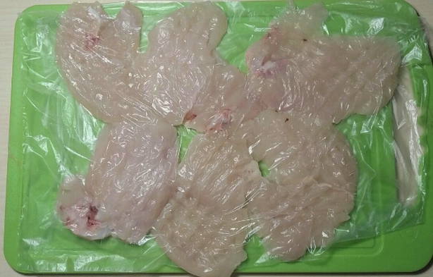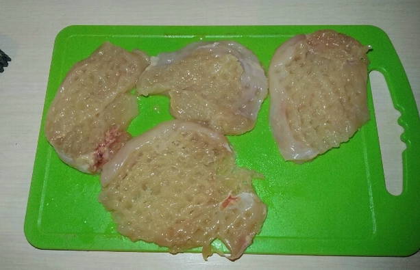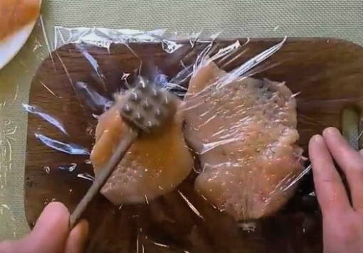 - We slaan het gesneden vlees eraf. Het is erg handig om dit te doen met huishoudfolie. Door de kipfilet ermee te bedekken, laat je tijdens het kloppen geen losse stukken vlees over het werkblad vliegen. Volgens de regels worden filets van beide kanten geslagen met een speciale hamer.