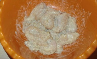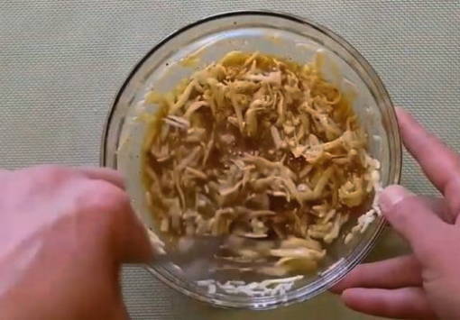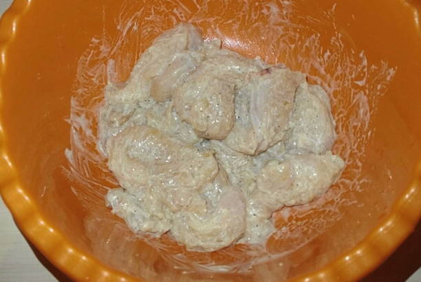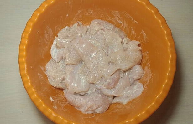 - We sturen de gebroken borden met kippenvlees naar een bord, voegen daar zure room toe (als je geen zure room hebt, kan mayonaise het gemakkelijk vervangen). Zout ons halffabrikaat en voeg naar smaak zwarte gemalen peper toe. Meng alle ingrediënten en laat het vlees een beetje marineren (ongeveer 15-20 minuten).