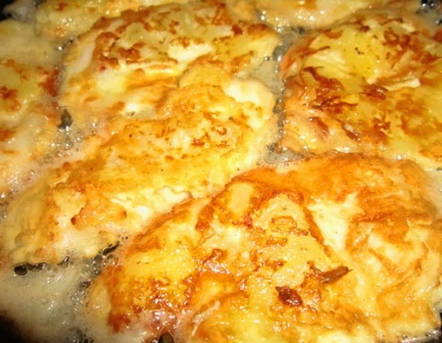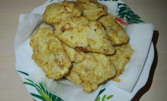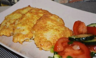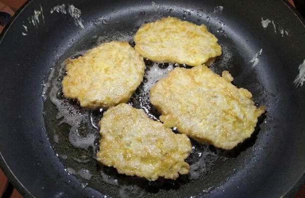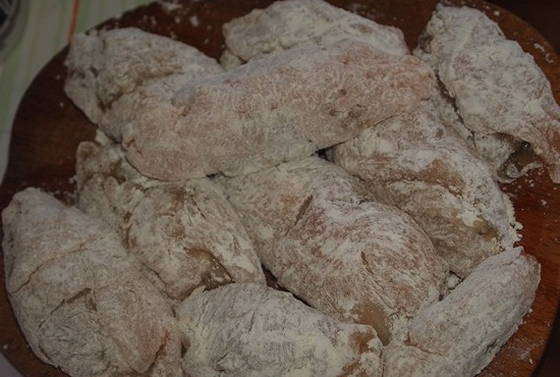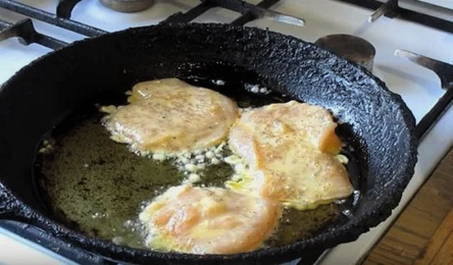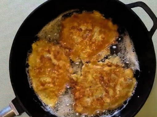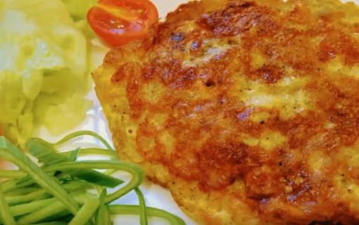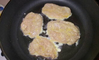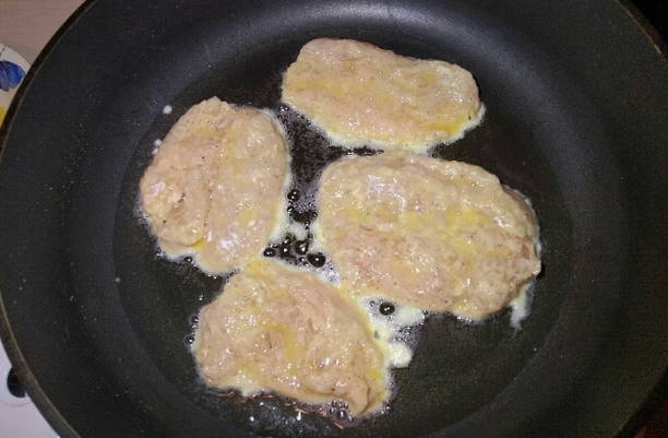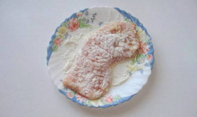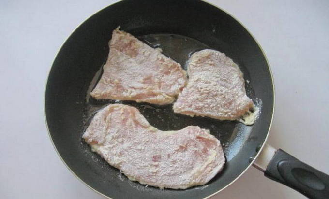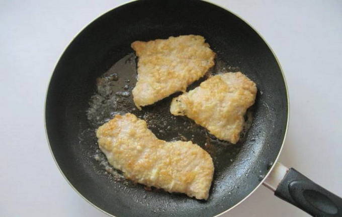 - Verwarm een koekenpan voor, giet er een kleine hoeveelheid zonnebloemolie in. Als de zonnebloemolie heet is, zet je het vuur middelhoog. Dompel elk stuk filet in bloem, dan kaas en eierbeslag. Stuur de karbonades naar een hete koekenpan.
