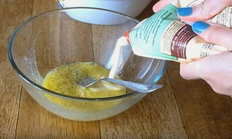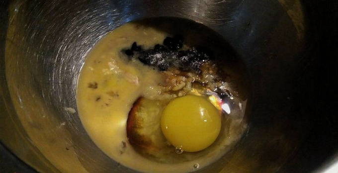 - Laten we het beslag klaarmaken. Klop hiervoor het ei in een diepe kom of kom, voeg een beetje zwarte peper en mayonaise toe. Mix de ingrediënten tot een gladde massa. Heb je klontjes, gebruik dan de staafmixer. In een paar pulsen zal hij de taak aankunnen om de ingrediënten met elkaar te combineren.