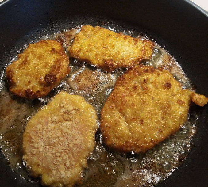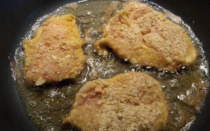 - Verwarm een koekenpan voor, giet er zonnebloemolie in. Bak de karbonades aan elke kant 2-3 minuten. Als je ze langer bewaart, bestaat de kans dat de broodkruimels aanbranden.