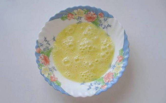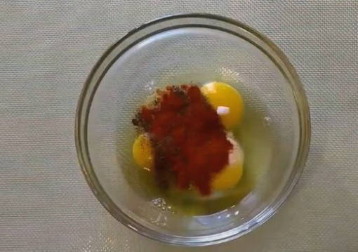 - Maak na het bereiden van de kipfilet het beslag. Breek de eieren in een diepe kom. Giet ½ theel. zout, paprika en zwarte peper. Klop het eiermengsel luchtig. Het moet uniform zijn.