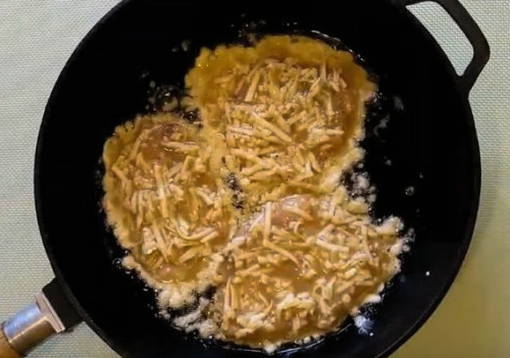 - Sappige kipfiletkoteletten met kaas in een pan