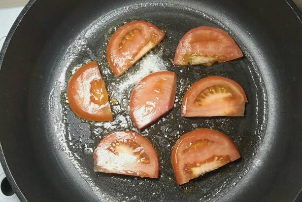 - Terwijl de karbonades aan het marineren zijn, beginnen we met de tomaten. We wassen ze, verwijderen de steel en de harde kern (meestal bij onrijpe tomaten). Snijd ze in dunne halve ringen en bak ze aan beide kanten in een hete koekenpan in een beetje zonnebloemolie. In totaal duurt het 5-8 minuten.
