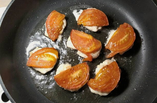 - Schep de afgewerkte tomaten uit de pan op een bord. Dit doen we zorgvuldig om de plakjes niet te beschadigen.