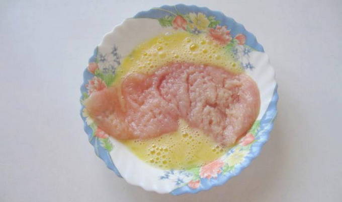 - Dip de losgeklopte kip in een bord met losgeklopte eieren. Draai meerdere keren van de ene naar de andere kant zodat het hele oppervlak van de toekomstige hak in het eiermengsel zit.