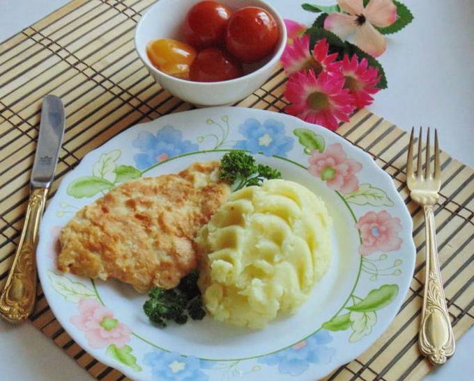 Meestal worden kippenkoteletten gekookt in beslag of ei met bloem, ze blijken zacht en smakelijk te zijn. Maar als je van knapperig houdt in vleesgerechten, vervang dan bloem door paneermeel. Krokante korst en malse filet van binnen, wat is er beter!