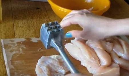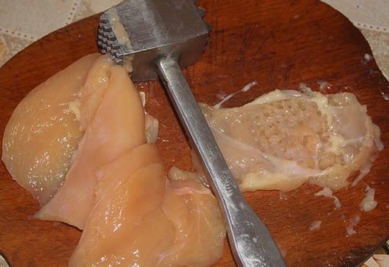 - Bereid de kipfilet voor. Was het, dep droog met keukenpapier om overtollig vocht te verwijderen. Snijd het in plakjes en sla ze aan beide kanten met een speciale hamer. Gebruik huishoudfolie of perkament om de kipfilet los te kloppen. Ze voorkomen dat stukjes kipfilet uit elkaar vliegen tijdens het kloppen.