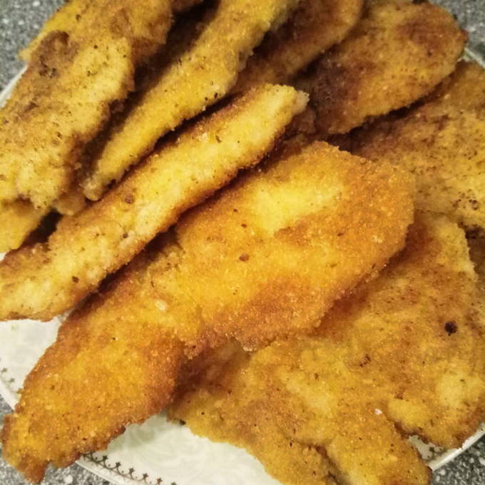 - Zet een koekenpan op het vuur, giet er plantaardige olie in en verwarm goed. Dip de gebroken kipfilet eerst in paneermeel, dan in het eiermengsel en nogmaals in het paneermeel. Grill op middelhoog vuur tot zich een karakteristieke bruinachtige korst vormt. Houd er rekening mee dat broodkruimels snel verbranden.