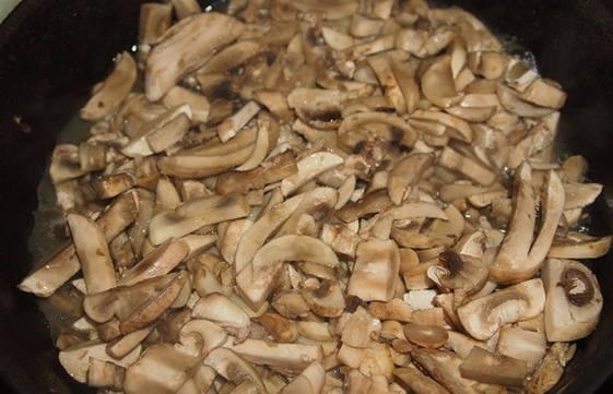 - Maak het vuil van de paddenstoelen schoon. Als je paddenstoelen klein en jong zijn, volstaat het om ze goed onder water af te spoelen. Als de paddenstoelen groot zijn, is het raadzaam om de schil van de dop en rok te verwijderen, ze vast te haken met een scherp mes en vervolgens te wassen. Champignons bereid en in kleine stukjes gesneden. Verhit een koekenpan met plantaardige olie en leg de champignons erin. Bak ongeveer 10 minuten.
