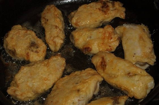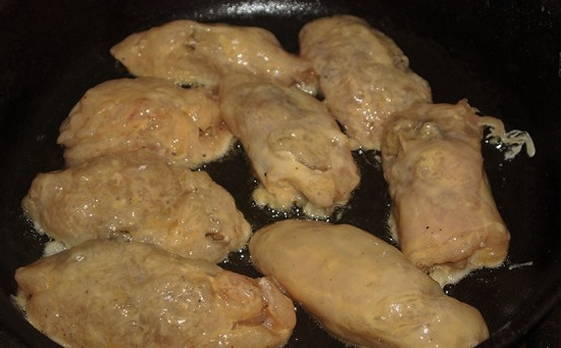 - Giet meer zonnebloemolie in dezelfde koekenpan en bak de ingelegde karbonades erop. Middelmatige hitte is optimaal voor het braden van kippenkoteletten.