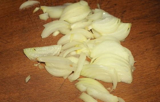 - Terwijl de champignons gebakken zijn, schil je de ui, spoel je hem af en hak je hem fijn. Kies de grootte van de stukken volgens uw voorkeuren.