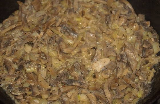 - Fruit de gesnipperde ui samen met de champignons nog 10 minuten. Als de champignons een beetje sap afgeven, kun je een beetje water toevoegen en mee laten sudderen.