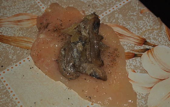 - Leg de champignons gebakken met uien in het midden van elke kipfilet.