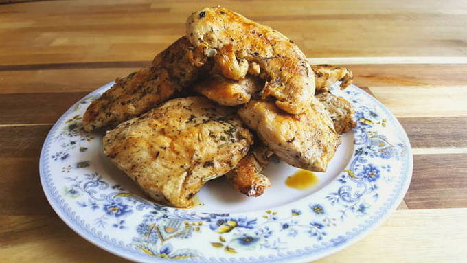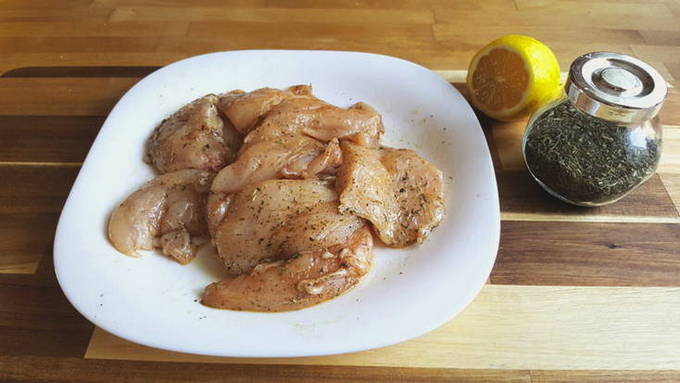 - Was de kipfilets. Droog ze. Verwijder het bot, laat alleen de filets over. Snijd de filets in steaks van ongeveer een centimeter dik. Bij het grillen in een pan is het beter om het vlees niet te kloppen zodat het sappig is, daarom moet de dikte van de biefstuk minder worden gekozen dan voor gewone karbonades. Als je wilt dat de kipfilet heel snel gaar is, sla hem dan af. Doe dit met een speciale hamer, nadat je de snijplank hebt afgedekt met huishoudfolie. Dek de karbonade zelf af met huishoudfolie. Zo blijft de keuken schoon. Breng de resulterende karbonades over in een diepe kom, zout, voeg peper, paprika en Provençaalse kruiden toe. Voeg vervolgens ongeveer een theelepel citroensap toe (dan worden de filets nog zachter) en een eetlepel olijfolie (door een olieachtige film op het oppervlak van de karbonade te vormen, laat de olie het sap van hun kipfilets niet lekken uit).