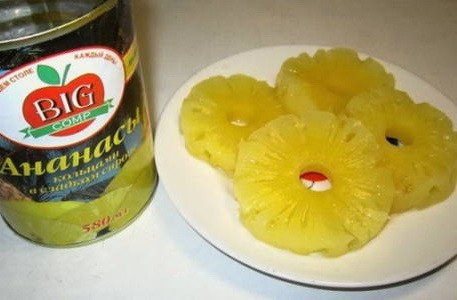 - Ananas uit blik wordt meestal gebruikt om warme maaltijden te bereiden. Voor dit recept kun je het beste ananasringen gebruiken in plaats van stukjes. Ananasringen in potten zijn meestal erg dik en kunnen het beste in twee ringen worden gesneden.