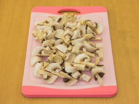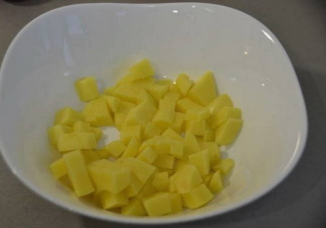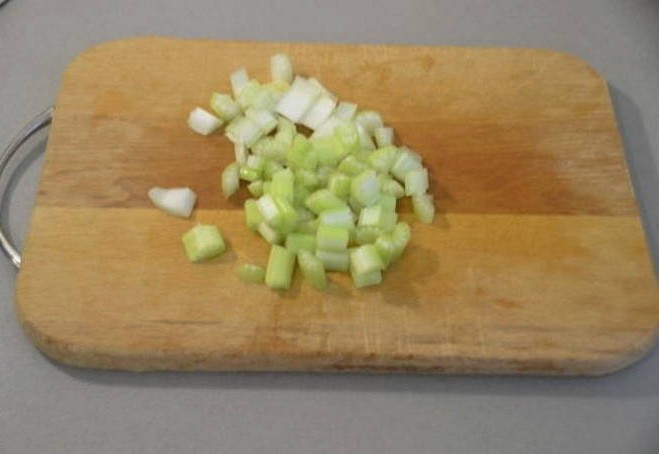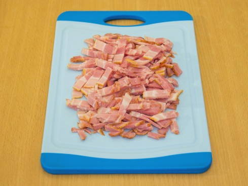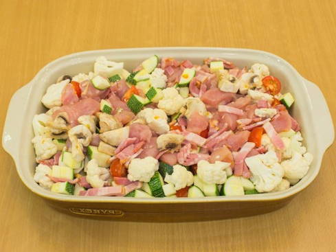 - Doe gehakte groenten, kipfilet en spek in een vorm, meng de ingrediënten.