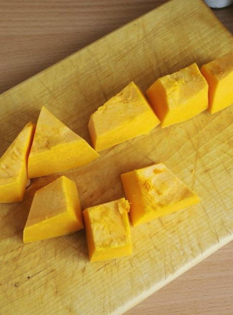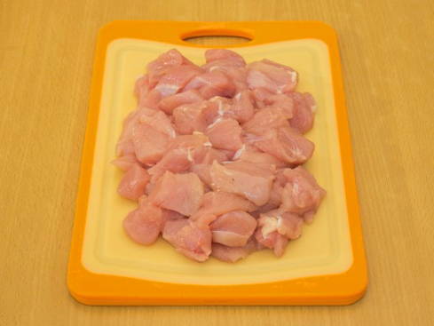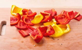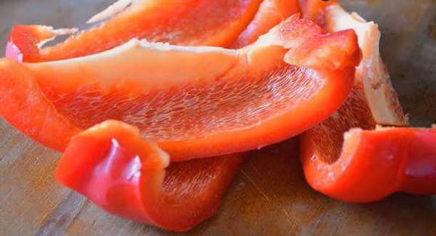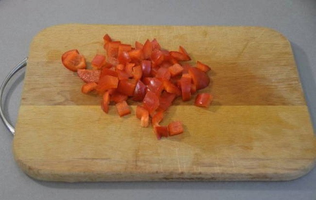 - Schil de paprika van zaden en tussenschotten, snijd het vruchtvlees in blokjes.