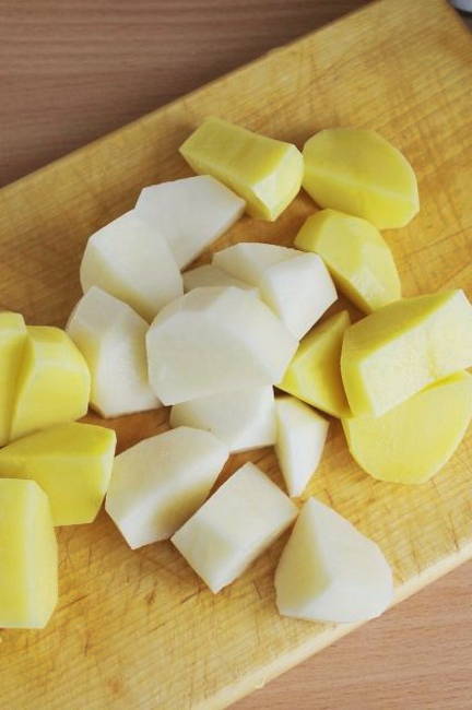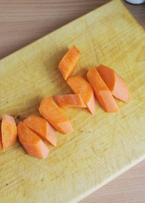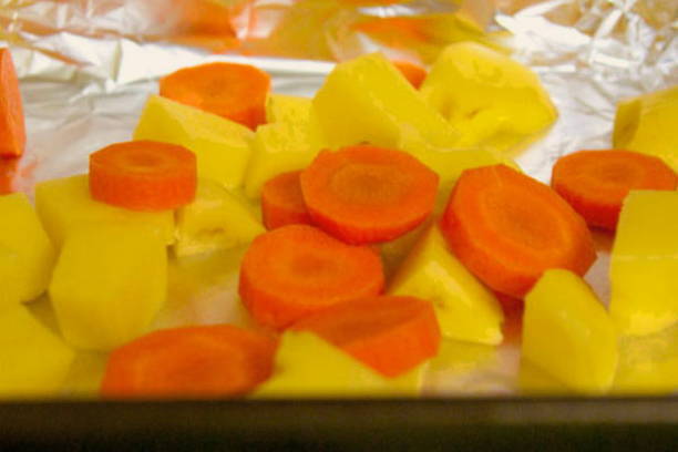 - Bedek de bakplaat met folie, vet deze in met plantaardige olie. Aardappelen en wortelen schillen, in grote stukken snijden en op folie leggen.
