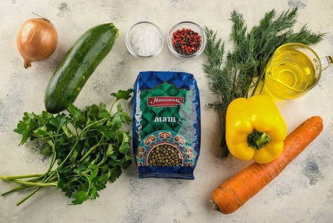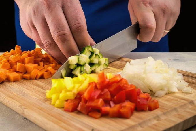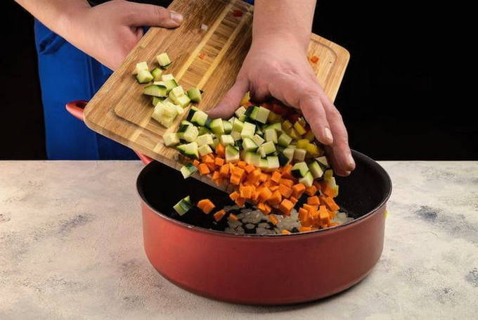 - Snijd de uien in halve ringen. Snijd de courgette, wortel, paprika in blokjes.