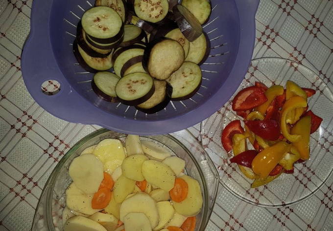 - Was en schil groenten. Snijd de aardappelen, aubergines en wortelen in plakjes. Snijd de paprika in grote blokjes.