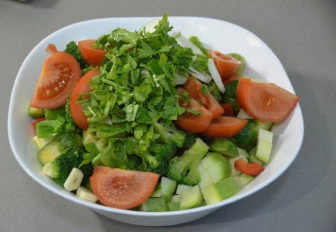 - Zout groenten, breng op smaak, besprenkel met plantaardige olie en roer.