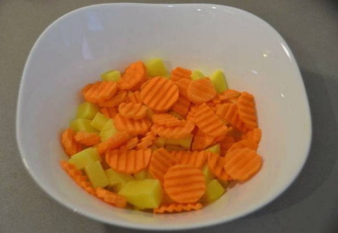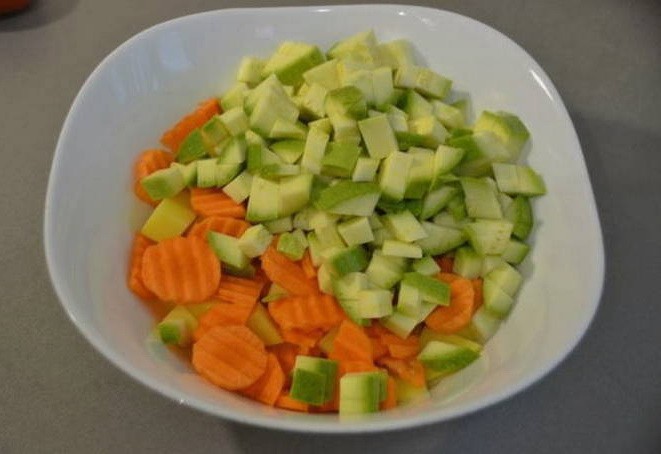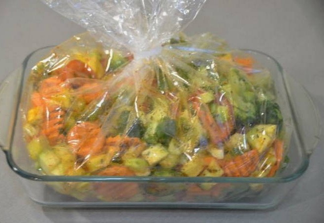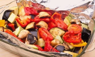 - Doe de groenten in een braadslee, voeg zout en kruiden toe, zet de randen van de hoes vast en schud de inhoud lichtjes. Plaats het pakket voor het gemak in de vorm.