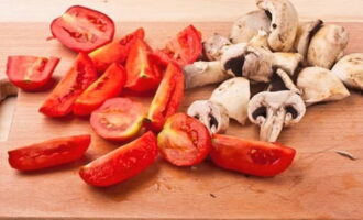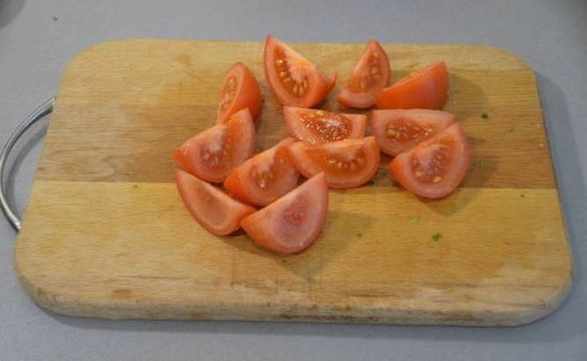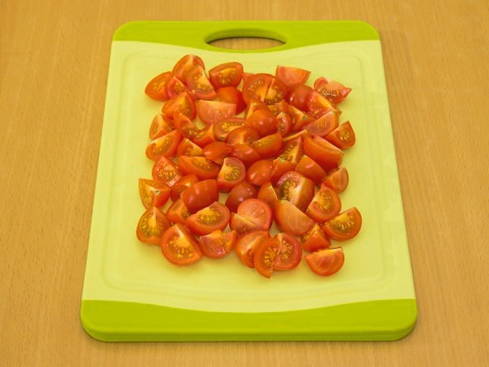 - Was de tomaten. Snijd kleine groenten in vieren, grotere in blokjes.
