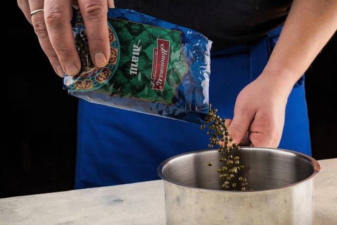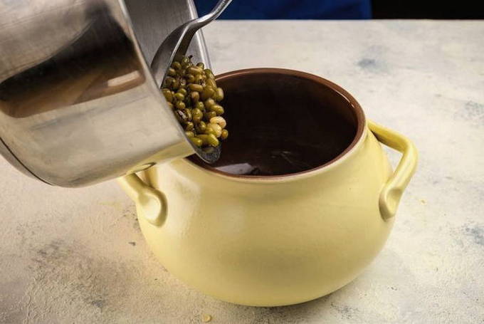- Doe de mungboon in de potten, doe dan de gebakken groenten, breng op smaak met de inhoud van de potten.