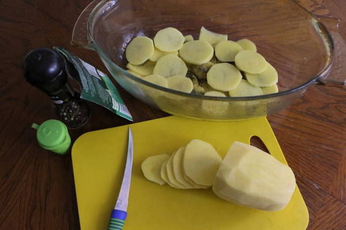 - Snijd de aardappelen in dunne plakjes. Vet een ovenschaal in met plantaardige olie, leg de aardappelen, zout en breng op smaak.