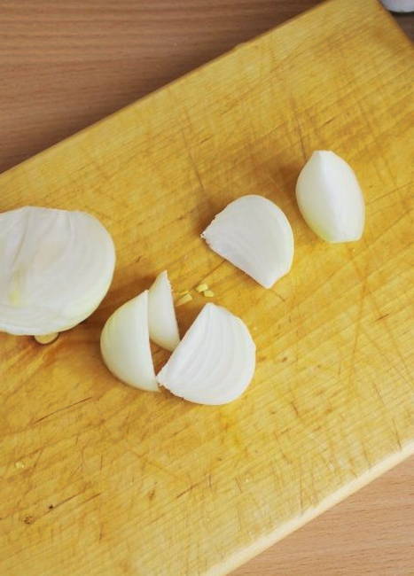 - Hak de knoflook heel fijn of haal door een pers. Snijd de ui in dunne plakjes.
