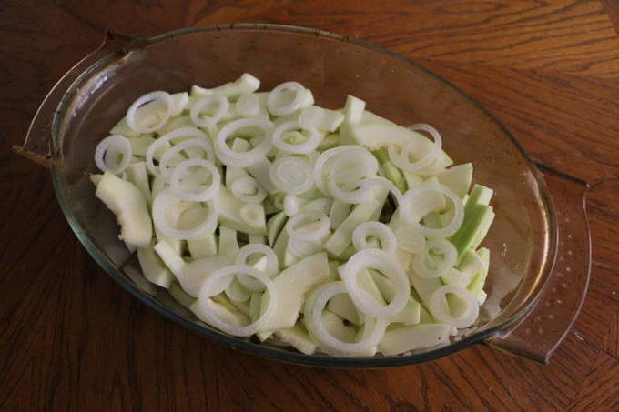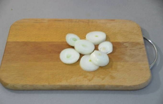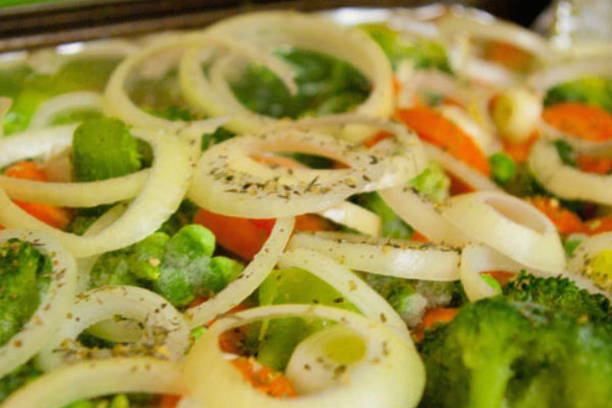 - Snijd de uien in ringen en voeg ze toe aan andere groenten. Kruid de groenten met zout en breng op smaak.