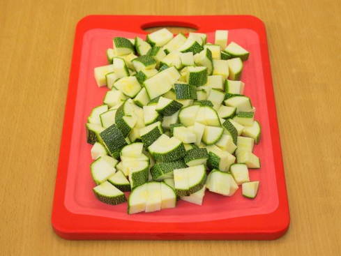 Was de groenten. Snijd de aubergine en courgette in grote blokjes.