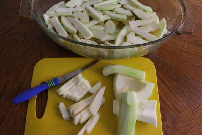 - Snijd de courgette in partjes en leg ze op de aardappelen, ook zout en breng op smaak.