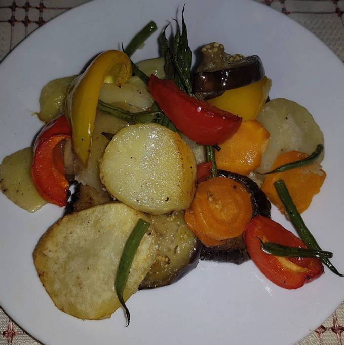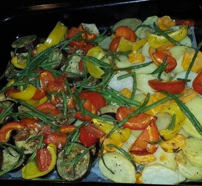 - Leg eerst de aardappelen, aubergine en wortelen op een bakplaat. Zet de bakplaat 20 minuten in een voorverwarmde oven op 180 graden. Voeg vervolgens de gesneden tomaten, paprika, gehakte knoflook en aspergebonen toe.
