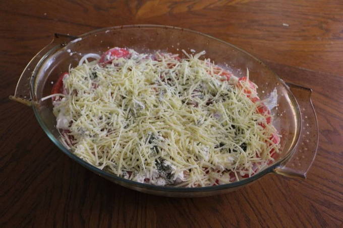- Leg vervolgens een laag tomaten, vul de blanco met zure room en bestrooi met geraspte kaas.