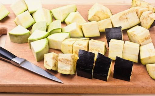 Was de groenten. Snijd de aubergine en courgette in grote blokjes.