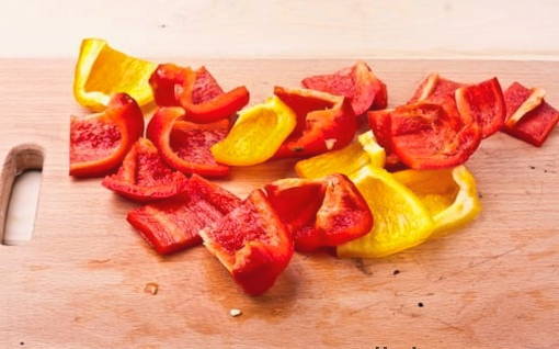- Schil de paprika van zaden en tussenschotten, snijd het vruchtvlees in blokjes.