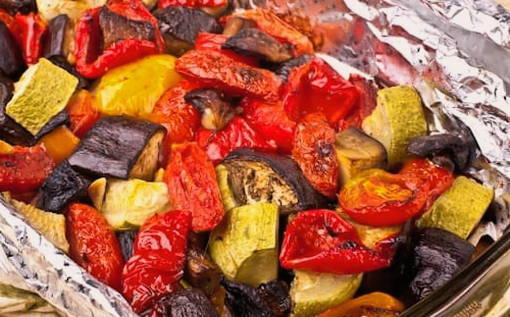 Dek de groenten af met folie erop en zet de randen vast. Bak groenten ongeveer een uur in de oven op 210 graden. Verwijder vervolgens het bovenste vel folie en kook de groenten nog 20 minuten.