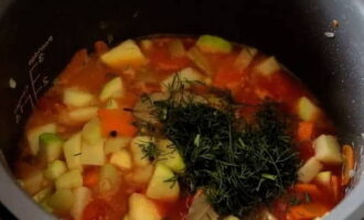 We doen greens, laurier en zwarte peper in een multikoker, mengen grondig en laten sudderen tot het hoofdvolume van de vloeistof kookt.