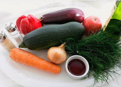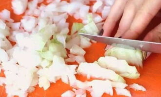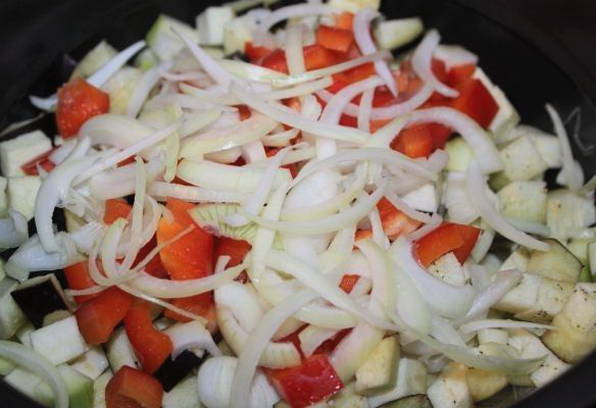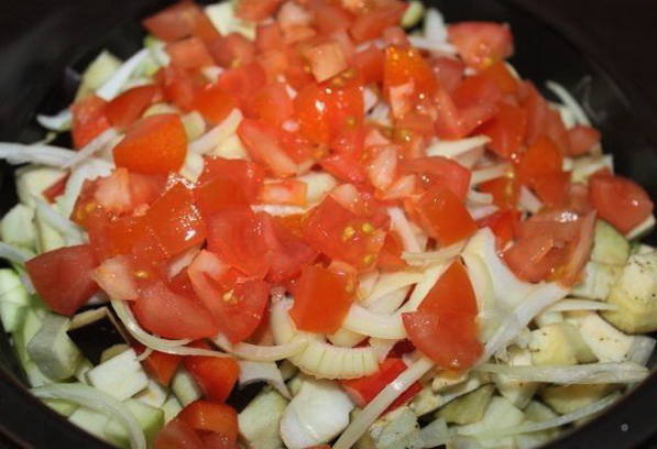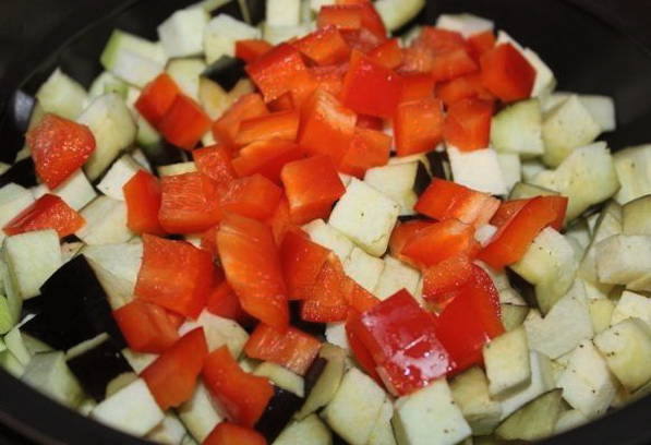 - We bereiden groenten, wassen ze, drogen ze en snijden de courgettes en aubergines in kleine blokjes. Snijd de tomaten in plakjes, de peper in blokjes en snipper de ui.