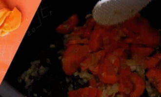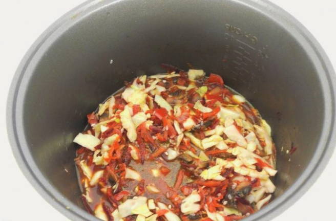 We snijden ook de paprika's. Voeg toe aan de multicookerkom en meng goed. We gaan door met blussen.