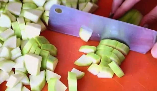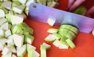 - We maken de courgette schoon, snijden hem in middelgrote blokjes.