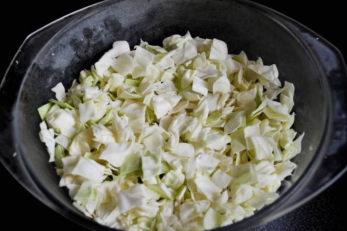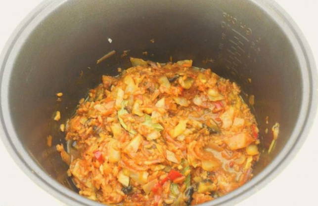 - We versnipperen de kool, spoelen de rijst af en doen ze ook in een slowcooker. Zout alles naar smaak.